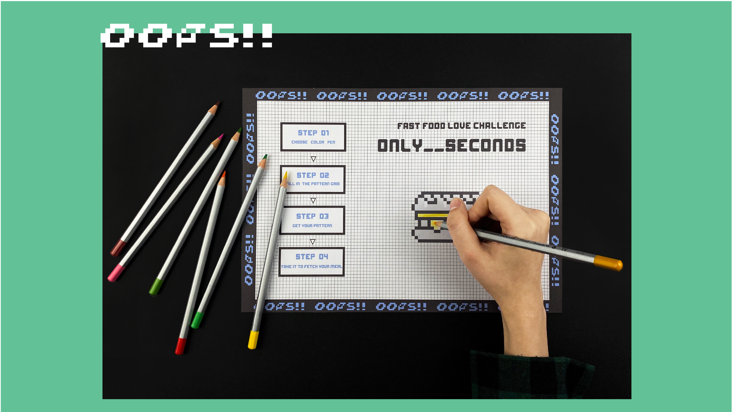OOPS – Fast-Food Love Series explores the phenomenon of “fast-food love” — relationships defined by speed, convenience, and emotional instability. Through interactive posters, pixelated placemats, and packaging design, the project visualizes how modern love is consumed like fast food: instantly satisfying yet fleeting.